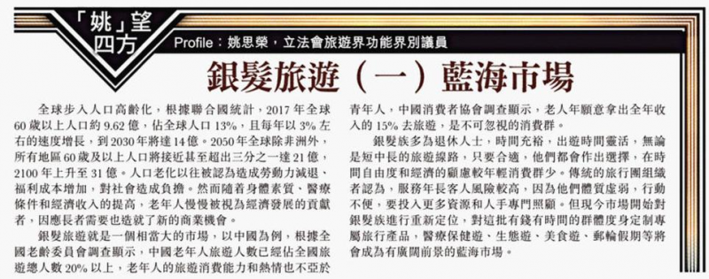 銀髮族多為退休人士,時間充裕,出遊時間靈活,無論是短中長的旅遊線路,只要合適,他們都會作出選擇,在時間自由度和經濟的顧慮較年輕消費群少。傳統的旅行團組織者認為,服務年長客人風險較高,因為他們體質虛弱,行動不便,要投入更多資源和人手專門照顧。但現今市場開始對銀髮族進行重新定位,對這批有錢有時間的群體度身定制專屬旅行產品,醫療保健遊、生態遊、美食遊、郵輪假期等將會成為有廣闊前景的藍海市場。