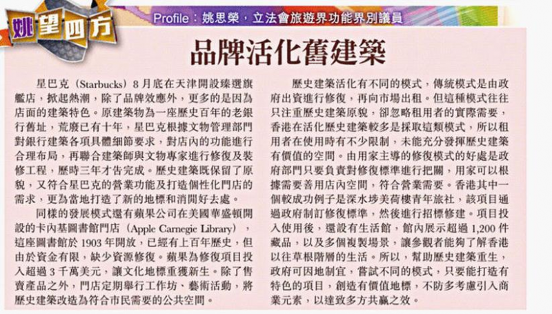 歷史建築活化有不同的模式,傳統模式是由政府出資進行修復,再向市場出租。但這種模式往往只注重歷史建築原貌,卻忽略租用者的實際需要,香港在活化歷史建築較多是採取這類模式,所以租用者在使用時有不少限制,未能充分發揮歷史建築有價值的空間。由用家主導的修復模式的好處是政府部門只要負責對修復標準進行把關,用家可以根據需要善用店內空間,符合營業需要。香港其中一個較成功例子是深水埗美荷樓青年旅社,該項目通過政府制訂修復標準,然後進行招標修建。項目投入使用後,還設有生活館,館內展示超過1,200件藏品,以及多個複製場景,讓參觀者能夠了解香港以往草根階層的生活。所以,幫助歷史建築重生,政府可因地制宜,嘗試不同的模式,只要能打造有特色的項目,創造有價值地標,不防多考慮引入商業元素,以達致多方共贏之效。