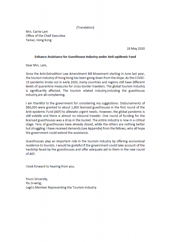 18 May 2020 Wrote to Chief Executive of Hong Kong— Enhance Assistance for Guesthouse Industry under Anti-epidemic Fund